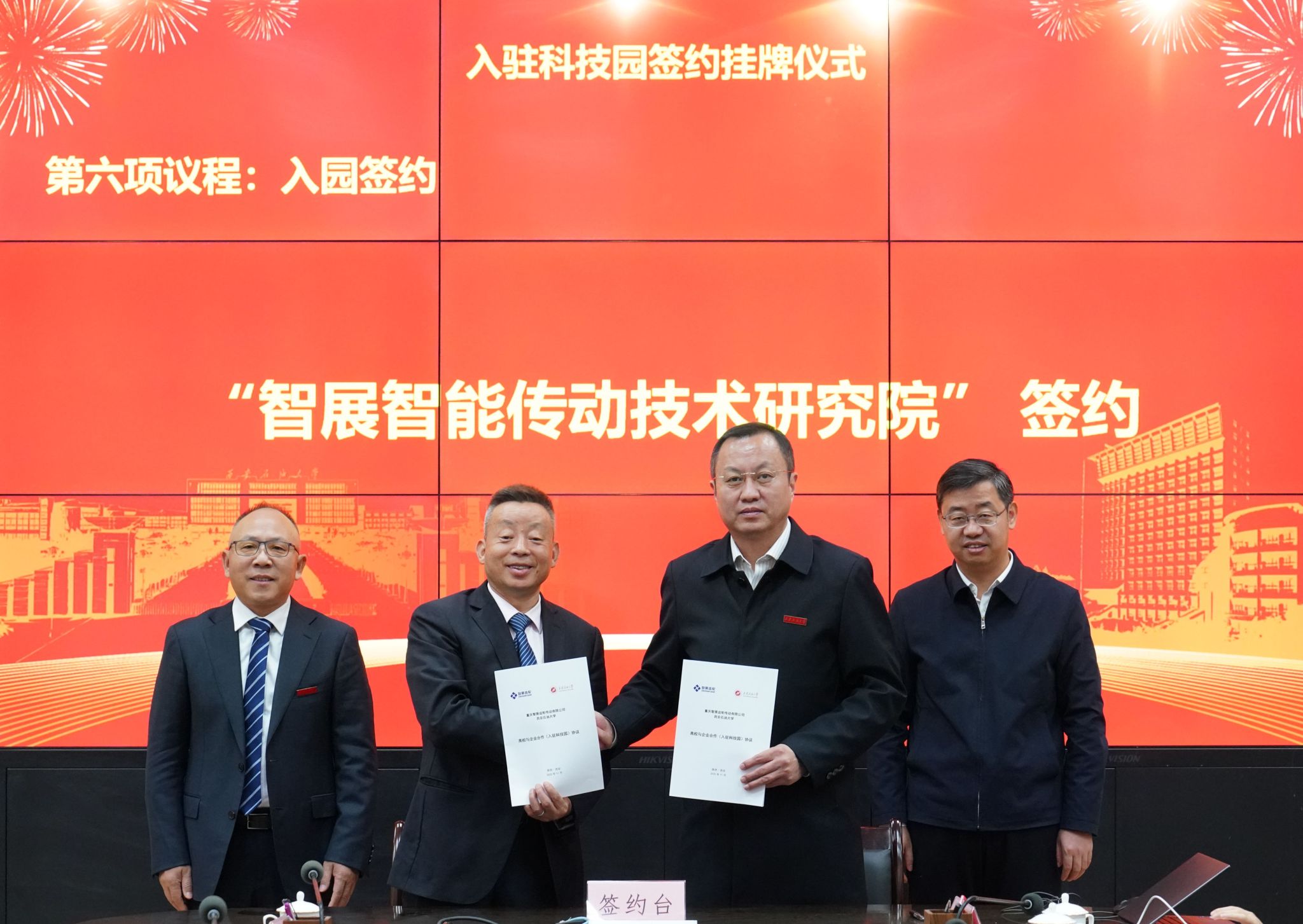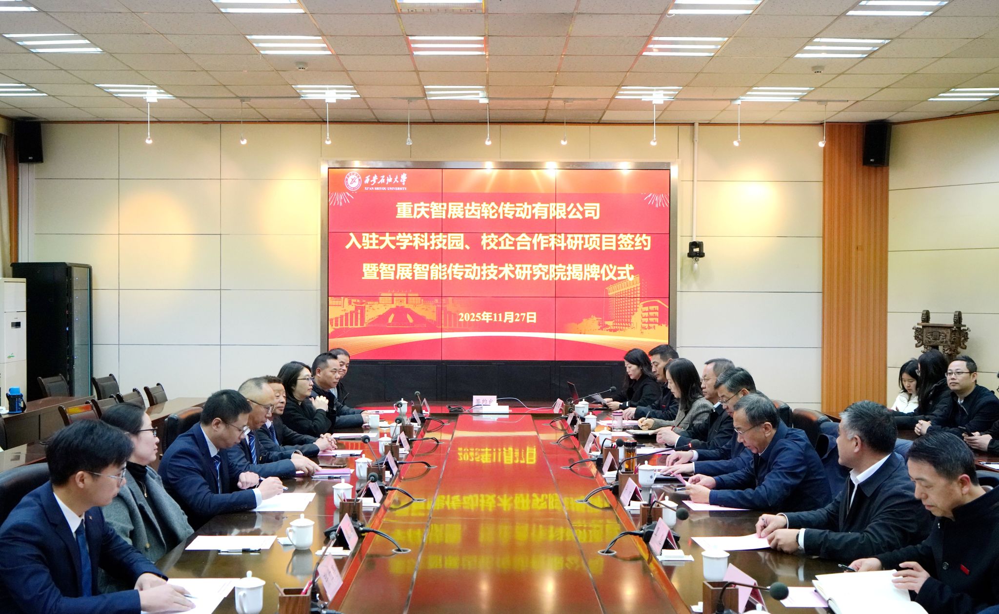 11月27日上午,我校在雁塔校区会议中心第二会议室举行重庆智展齿轮传动有限公司(以下简称智展公司)入驻大学科技园、校企合作科研项目签约暨智展智能传动技术研究院揭牌仪式。校长王进富,副校长张荣军出席仪式。智展公司董事长、我校校友何荣一行11人,学校相关职能部门负责人,机械工程学院党政领导及师生代表参加活动。仪式由校党委副书记张木主持。