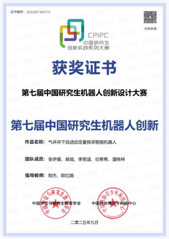 9月26日至29日,第七届中国研究生机器人创新设计大赛全国总决赛在山东省济南市融创国际会议中心隆重举办。本届大赛报名启动以来,全国224家培养单位的1545支队伍参赛,较去年增加330余支。为保证大赛评审工作公平公正,大赛组委会邀请70家单位159位专家担任初赛评委。8月27日大赛初赛评审完成,最终来自104家培养单位的325支队伍入围决赛。我校机械工程学院“气井井下自适应定量排采智能机器人”作品获得全国三等奖,团队成员有张伊晨、姚瑶、李思涵、纪希希、潘栋梓,郑杰、欧红娟任指导教师。